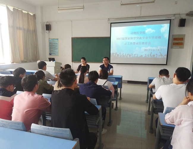 为进一步做好国家助学贷款的贷后管理工作,使贷款毕业生顺利离校,结合我校《关于做好2017届国家助学贷款毕业生毕业确认等有关事宜的通知》的要求,根据实际情况,动物医学院于2017年5月5日中午召开2017届国家助学贷款毕业生毕业确认工作暨诚信教育会,参会人员包括我院党总支副书记张瑞春、辅导员樊明明、各毕业班负责人以及贷款毕业生。