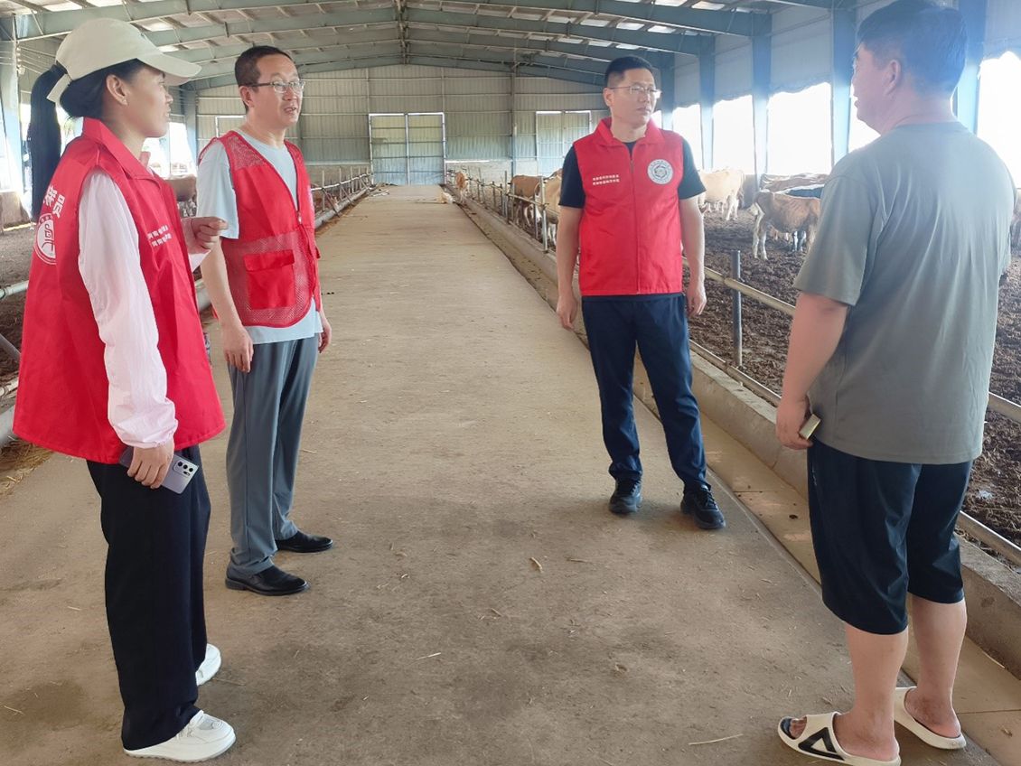 在确山县昌顺养殖专业合作社,服务团对牛舍环境、疫病防控、饲草储存、日粮搭配、粪污处理等问题进行现场调研,并与负责人钟森林进行详细沟通,服务团队发挥科技优势,针对夏季畜舍积涝、闷热、病原活跃等多发问题提出合理化解决方案。