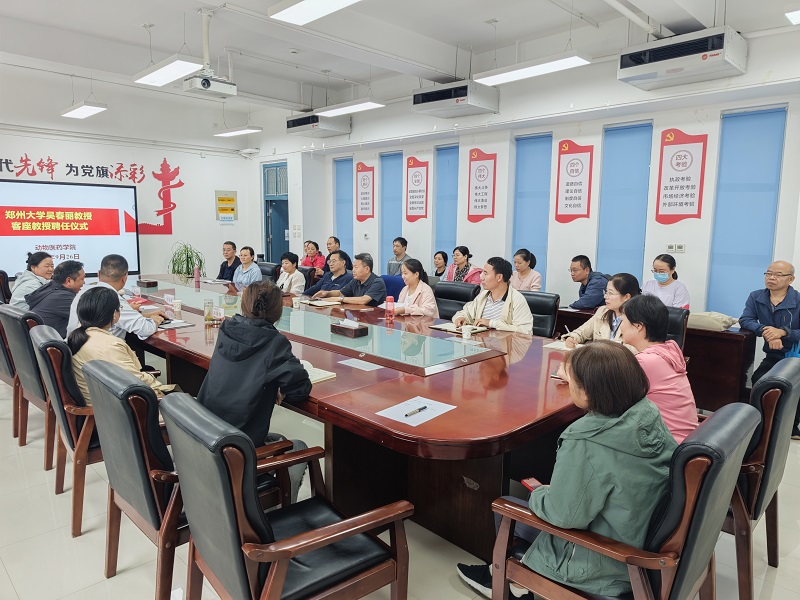 汤院长致欢迎辞,介绍了吴春丽教授的学术造诣及在行业的影响力。汤院长表示,学校此次聘任吴春丽女士为客座教授,旨在进一步打开ok138cn太阳集团古天乐办学思路、开拓人才队伍建设视野,全方位指导我校“兽医”硕士点、学科、科研团队及师资队伍建设等,吴教授的加盟将为河南牧业经济学院的发展带来新的活力和机遇,对提升学校科研创新综合实力,带动青年教师和科研团队共同进步,推动学校高质量发展发挥重要作用。