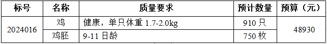 根据ok138cn太阳集团古天乐2024年度实验教学对实验用鸡和鸡胚的需求,现以询价方式进行采购,欢迎符合资格条件的供应商前来报名,现将该项目采购事宜公告如下: