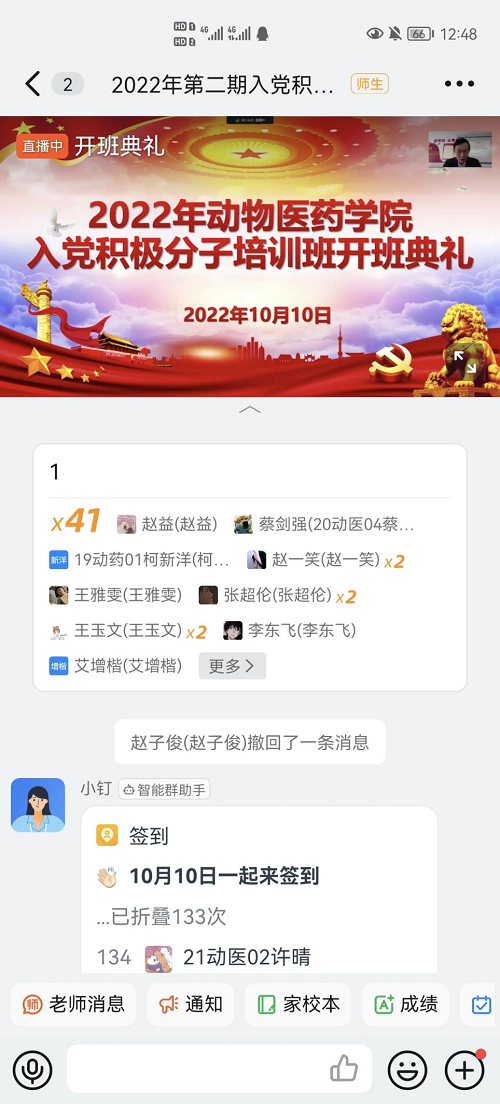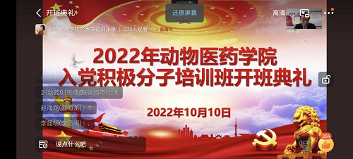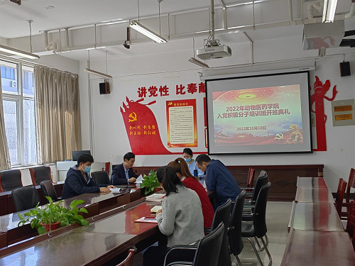 2022年10月10日中午,ok138cn太阳集团古天乐2022年第二期入党积极分子培训班开班典礼于生工楼C401会议室举行。ok138cn太阳集团古天乐党委书记刘永录,党委副书记汪洋,团委副书记陈雁雪和闫一博,以及全体辅导员到场,本期238名入党积极分子学员通过钉钉直播进行线上观看。