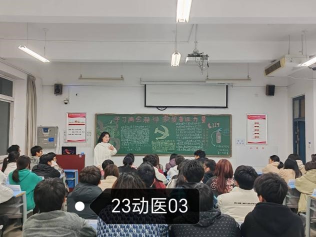 团课伊始,主持人以播放视频的方式带领各班学生认真回顾了两会的焦点内容,带领同学们再次回到2024年两会现场,身临其境领悟习近平同志的讲话核心。接着,主持人针对两会的召开时间、会议议程展开详述,全面地讲解了两会的各项事宜,也将“新质生产力”“新三样”“人工智能”等两会热词带入同学们眼中。随后,主持人鼓励同学们围绕两会热点话题,结合自身踊跃发言。23动药01的黄炎表示,我们在努力学习的同时应该关注国家政治、社会发展,积极参与社会实践,为国家建设贡献自己的力量。最后,主持人从2024年社会热点出发,强调两会不仅擘画了国家未来发展的宏伟蓝图,更明确了我们青年一代的时代重任和历史使命,要将“两会”精神融入平常。