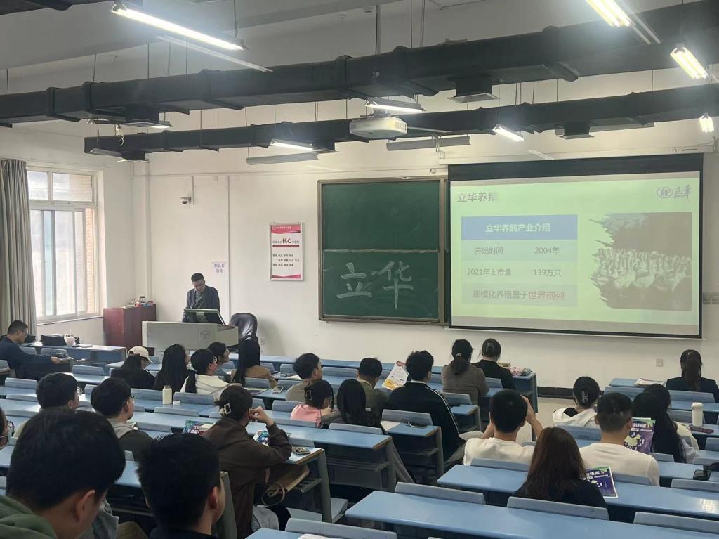 会上,宣讲人首先介绍江苏立华牧业股份有限公司的发展历史和企业概况。江苏立华牧业股份有限公司成立于1997年6月,是一家集科研、生产、贸易于一身、以优质草鸡养殖为主导产业的一体化农业企业,是国家级农业产业化重点龙头企业 、国家级农业标准化示范区。然后介绍了该公司的招聘需求、职业发展、薪资待遇、节假日福利,并鼓励同学们在立华牧业奋斗青春。最后,宣讲人和同学们就企业相关问题展开问答。